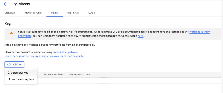 Having done that, you can now create a key for your service account. To do that, go to the Keys tab and click on Add Key, then Create new key.