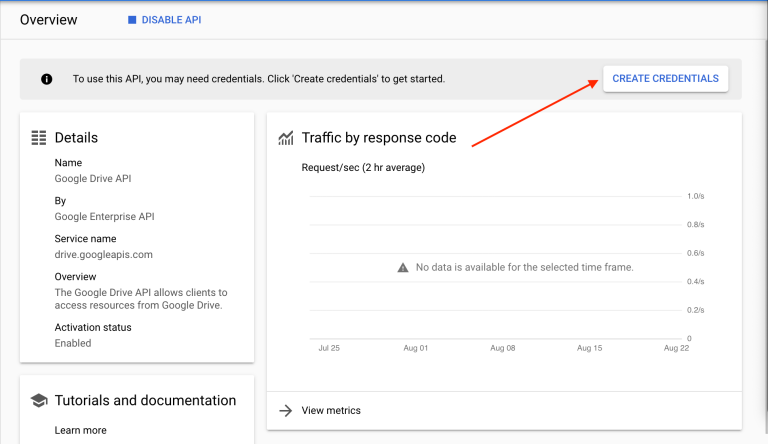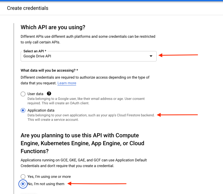 - Therein, setup credentials by selecting Google Drive API in the dropdown, select the Application Data radio button and since we won’t be using it with any Compute or Cloud service (for now), select No in the options for the same.