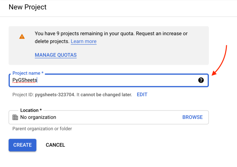 - Give project a name and click Create. Once you do, select the newly created project from your notifications.
