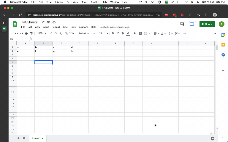 sheet = client.open(SHEET_NAME).worksheet(NAME_OF_INDIVIDUAL_SHEET)You can now use this sheet instance to do all the basic CRUD operations (put a pin in this) in that particular sheet.