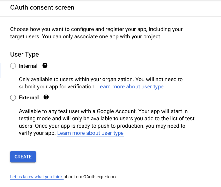 If you’re doing this with an account that is part of an organisation’s Google Workspace, you can select internal, however if you’re not you’ll have to select External. That will create credentials in testing mode, so you won’t have to deal with consent screen. However if and when you decide to make this production ready, you’ll have to verify your app, which you can learn more about here.
