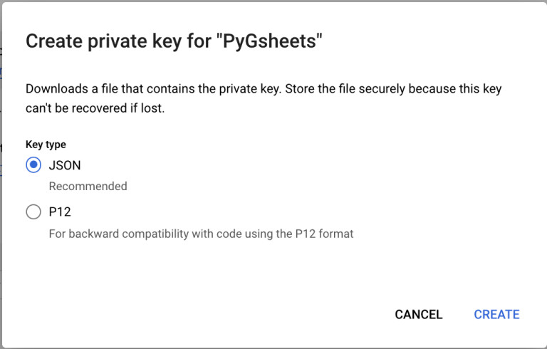- Select JSON in the popup that opens. That will download a json file with the private key for your service account.