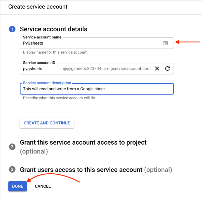 - Now, you’ll need to create a service account and get credentials for it. Give it a name and description if you like and skip the rest for now. Then click Done.